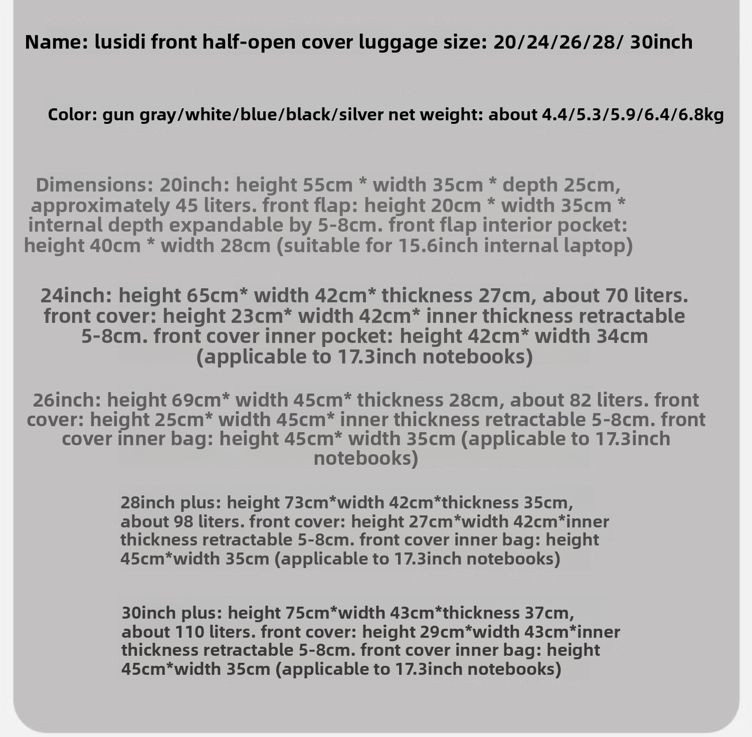 20-inch: 44 cm (H) x 34 cm (W) x 20 cm (D)